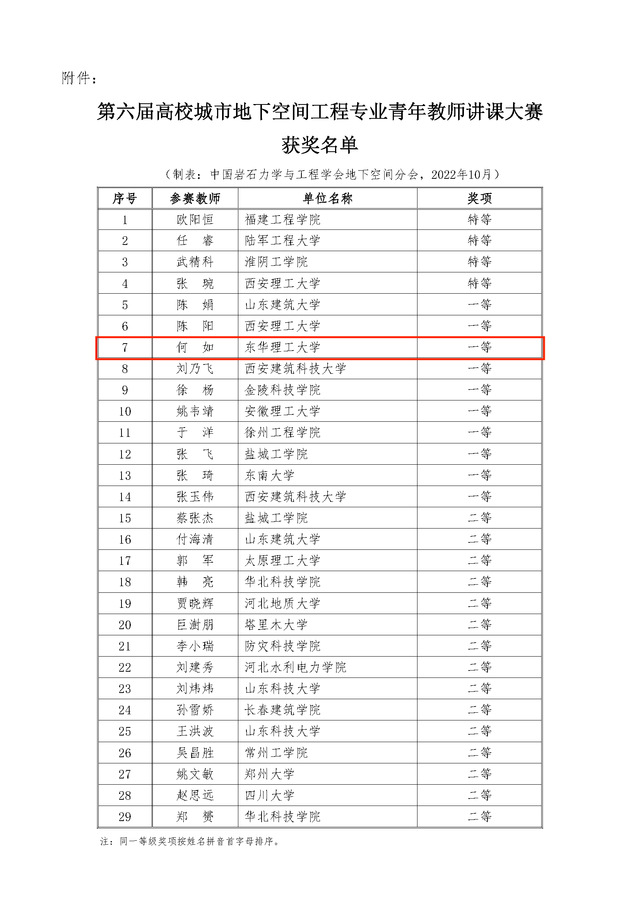 来自全国33所高校的49位城市地下空间工程专业青年教师参加了本次青年教师讲课大赛。经过激烈的角逐,我校土木与建筑工程学院教师何如博士荣获一等奖。竞赛中,何如博士结合工程实例及二十大报告精神,注重教学情境设计,深入浅出地讲解知识要点,以丰富翔实的教学内容和干货满满的授课方式,充分展现了我校青年教师的专业水平和教学风采。这也是该专业教师继获第三届高校城市地下空间工程专业青年教师讲课大赛一等奖后,再获殊荣。