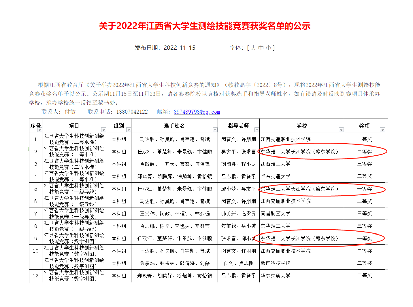 11月23日,竞赛获奖名单已公示完毕,我院张求喜、吴友平、邱小梦等3位教师指导的任双江、董楚轩、朱景航、卞健鹏等4位同学获二等水准测量、一级导线测量赛项一等奖,数字测图赛项二等奖。