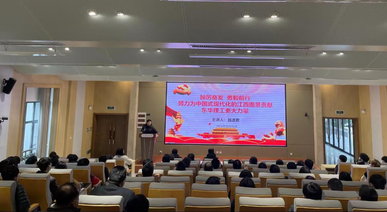 12月13日,东华理工大学二十大精神宣讲团成员、博士生导师、二级教授聂逢君为信息工程学院、软件学院全体教职工和学生党员代表进行了题为“踔厉奋发 勇毅前行 努力为中国式现代化的江西图景贡献东华理工更大力量”的二十大精神宣讲报告,学院党委书记许志文主持报告会。