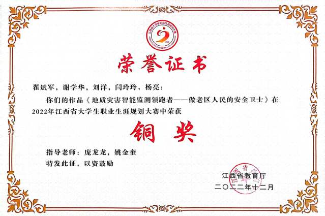 近日,由省教育厅主办的主题为“梦想未来 ‘赣’出精彩”2022年江西省大学生职业生涯规划大赛结果揭晓,我院推荐的作品《地质灾害智能监测领跑者----做老区人民的安全卫士》荣获铜奖,是我校唯一的获奖作品。