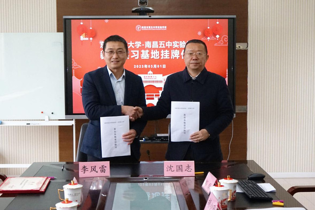 2023年3月1日上午,我校体育学院院长李风雷一行与南昌五中实验学校签署教育实习基地合作协议。南昌五中实验学校执行校长沈国志、党支部书记胡小玲、副校长袁雨芬及校办主任邱群等一同参加了签约仪式。