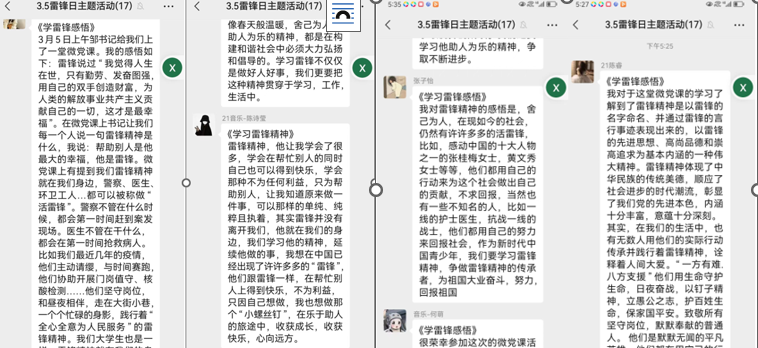 课后,党员同志交流了自己对雷锋精神的理解和感悟,表示要在今后的学习、工作和生活中,树立“向上”的人生姿态和“向善”的价值追求,在平凡的岗位上做一颗永不生锈的螺丝钉。宋宇写到:“雷锋走到哪里,春天就被他带到哪里。现实生活中,一些人对他人漠不关心,拒人于千里之外。殊不知,人心换人心,只有主动做他人的春天,我们的生活才能处处是春天。学习雷锋,我们就要像他一样,主动去做他人的春天”;程菲羽说:“我要追随光,散发光,成为光”;韩铮写到:“我要向优秀的人学习,虚心求教,力争上游。严于律己,用望远镜看待他人,用放大镜观察自己,经常做批评和自我批评,反省自己的缺点不足,不断更新自己的三观,做一个对社会有贡献的人”。(文:葛璇 图:蔡骏鑫、陈慧琳)