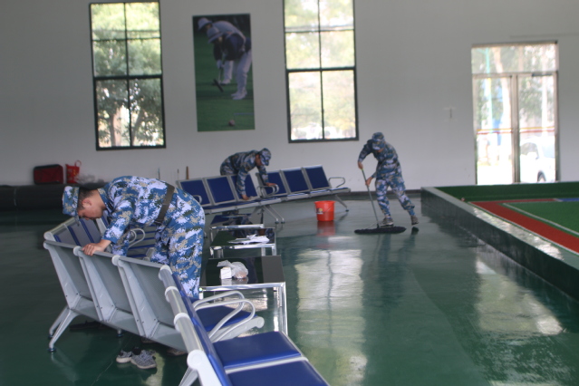 在学校门球馆,宋建勇老师带着大家一起清理着门球馆的角角落落。