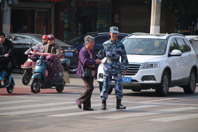 在人民公园十字路口,研究生辅导员林佳婷带着一群定向培养军士志愿者担任义务交通维护员,提醒行人注意交通安全。