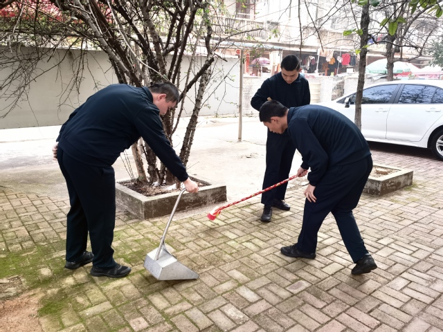 在西大街公园社区,定向培养军士志愿者在傅江辉老师的带领下开展环境卫生整治活动。