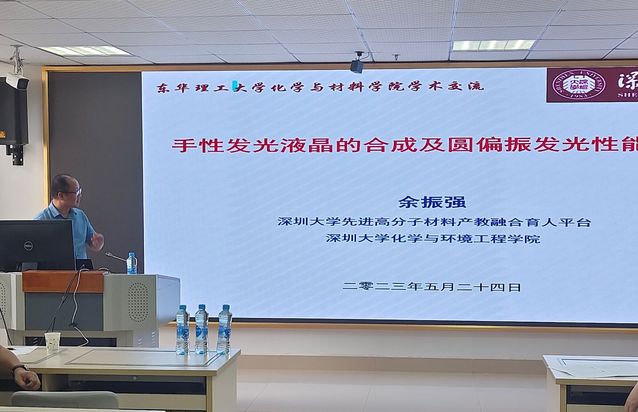 为推动学习贯彻习近平新时代中国特色社会主义思想主题教育扎实开展,进一步深化人才教育引领和联系服务这一民生工程。5月24日下午2点,应化学与材料学院的邀请,“化材视界”之“前沿的声音”系列第四期、第五期迎来了深圳大学徐坚和余振强两位教授,他们分别作了题为“全球科学与技术创新趋势与预测”和“手性发光液晶的合成及圆偏振光性能研究”的学术报告。学院副院长谢宗波教授主持报告会,学院青年老师、研究生和本科生80余人聆听了学术报告。