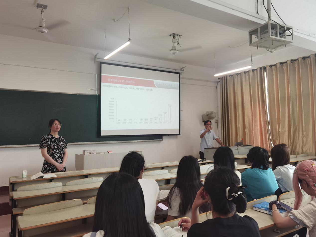 周明教授以“新中国成立以来经济发展成就回顾”为主题,用鲜活的案例,生动讲述了国民经济综合实力的显著变化和国际地位的显著提升,让学生明白在中国共产党的领导下,社会主义建设虽经历了曲折,但也取得了巨大的成就。罗洁老师深刻阐述了社会主义革命和建设的历史逻辑,让学生明白只有社会主义才能救中国,只有社会主义才能发展中国。课堂气氛活跃,受到同学们的欢迎。陈美伊同学认为,周明教授从经济学的角度讲述了中国共产党领导社会主义建设的故事,紧扣专业知识,收获很大;刘思岐同学认为,专业课老师与思政课老师同上一堂思政课,形式很创新,很有意义!(文/图 罗洁)