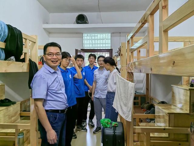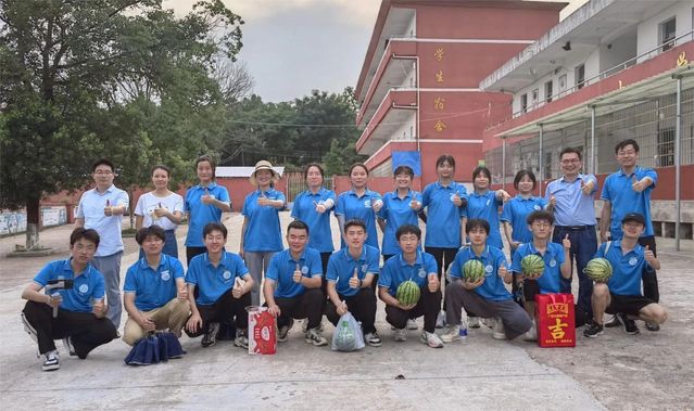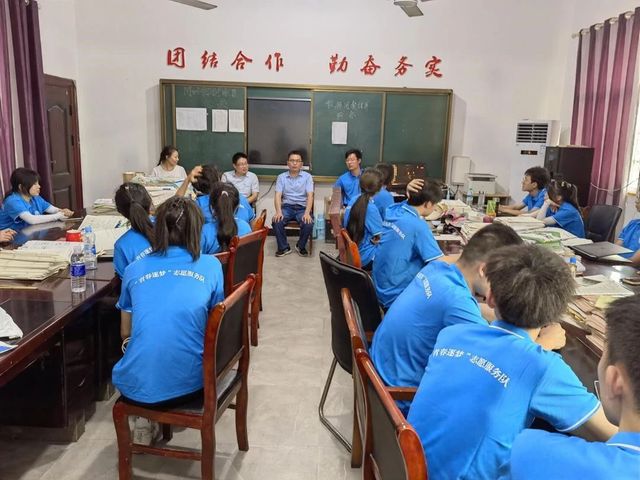 黄合湘、陈晓一行首先来到实践队驻地周坊初级中学,给同学们带来了一些生活用品和解暑物资,实地察看了同学们的住宿、用餐条件,并组织召开了座谈会。在座谈过程中,老师们详细询问了大家下乡期间的生活情况和个人感悟,中共预备党员王欣龙、廖文标,2022级学生郝煜结合个人实际,分别分享了“三下乡”这段时间自身在各个方面的成长。