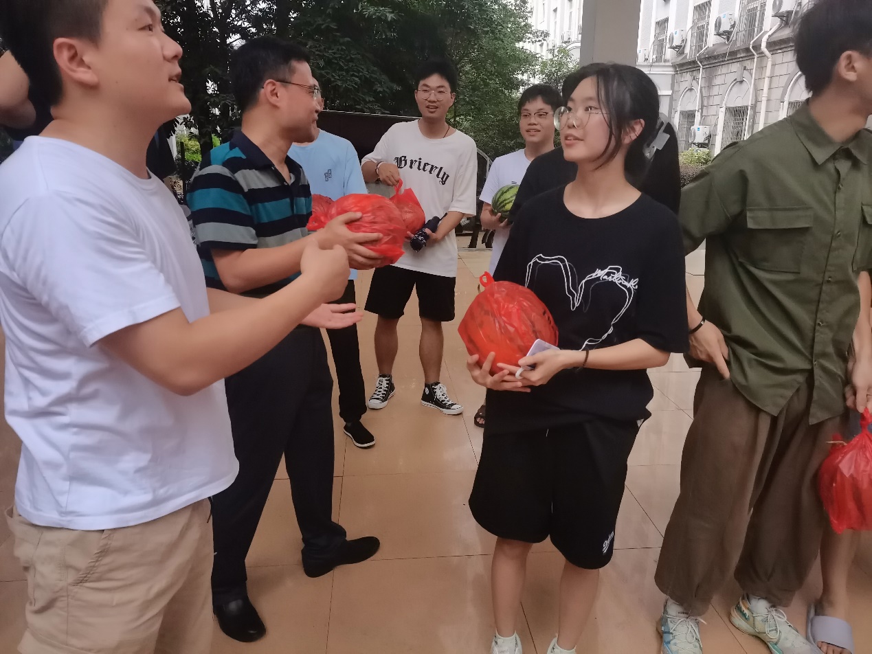 由于近期持续高温,机电学院领导班子心系留校考研学子,7月14日下午,院长王可、副书记邓文娟带队走进学生宿舍,开展“夏日‘送清凉’活动”,将学院采购的西瓜以及消暑物资发放给考研学子。