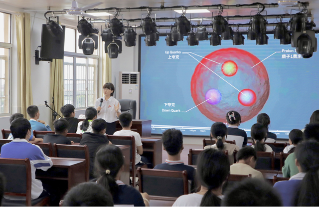 柳玉辉作了“人生‘核’处不相逢,相逢‘核’必曾相识”的科普讲座。通过“微观看发丝”的短视频巧妙地讲解了微观世界的物质结构、核技术的起源和基本原理,以及中国的核发展历史、核燃料的生产与使用过程以及核技术在生产生活的应用,并结合“两弹一星”功勋科学家的故事对现场同学进行了爱国主义、国防主题教育。