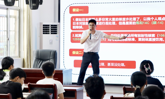 活动中,王英财作了“浅谈日本排放核污水事件”专题讲座,向参加活动的师生讲解了放射性元素的含义,核废水中放射性氚对生态环境的影响,福岛核事故背后的教训与启示,我国在核电安全设计方面取得的成效,以及科学理性应对此次事件的方法。