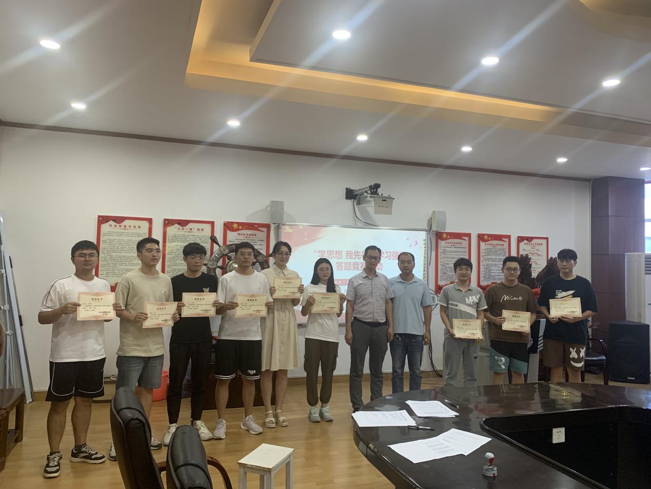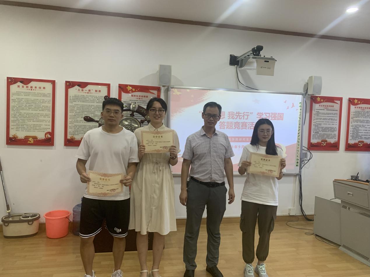 通过激烈的角逐,马肖慧带领的一号队获得冠军,王龙带领的八号队和杨安博带领的七号队分获亚军和季军。联系支部的何剑锋副院长为获奖选手颁发了奖状并合影留念,并对全体党员讲话,他希望通过这次活动更能激发支部党员的政治理论学习热情,形成“以赛促学、以学促干、以学促做、融会贯通”的良好政治理论学习氛围,增强支部同志们的战斗力和凝聚力。