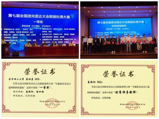 本届大会设“车载激光雷达行道树精细化提取”竞赛,东华理工大学测绘与空间信息工程学院蔡怡晨同学参加此次竞赛并荣获一等奖,指导老师惠振阳荣获第七届全国激光雷达大会数据处理大赛优秀指导老师。