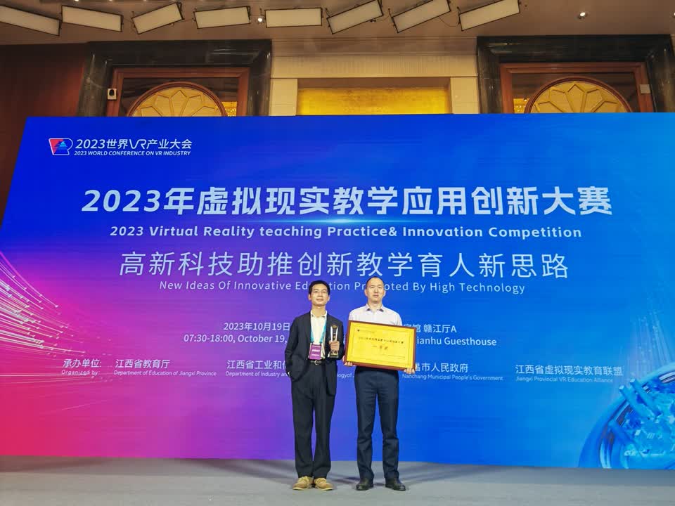 大会期间,还举行了2023虚拟现实教学应用创新大赛决赛,来自全国的37个团队参加。我校贺前钱博士团队作品“虚拟融合VR实训平台助力测绘新工科人才培养”获一等奖。