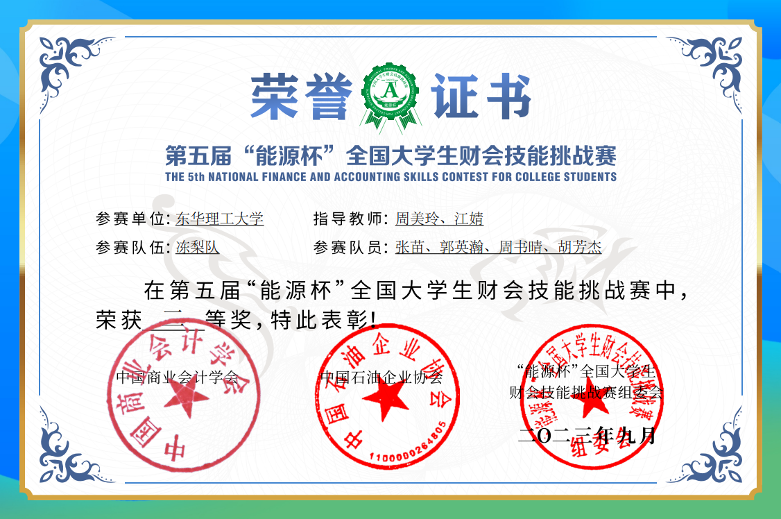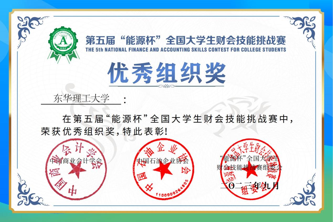 为加快推进我国高等院校一流大学和一流学科建设,全面提升财会类专业在校本科生和研究生专业技能,根据教育部大学生学科竞赛有关精神,2023年9月23日至9月24日,由中国石油企业协会、中国商业会计学会发起,西安石油大学承办的第五届“能源杯”全国大学生财会技能挑战赛在陕西西安举行,我校经济与管理学院代表队在财会技能挑战赛中获得二等奖,东华理工大学获优秀组织奖。