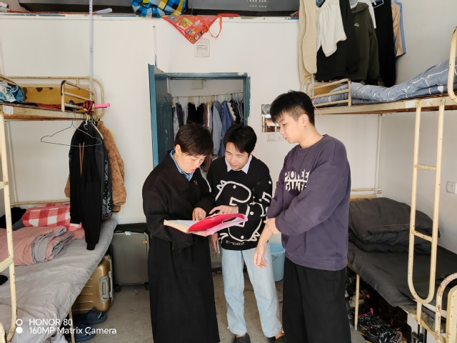 江汶俊来到2栋、3栋学生寝室与同学们亲切交流。在寝室里,江汶俊仔细询问每一位同学的情况,了解大家在学习生活上的状况和需求,鼓励同学们在在专升本备考中放松心态,养成良好的学习生活习惯,注意个人身心健康,加强体育锻炼。同时,江汶俊还从冬季防火、网络防骗、季节防病等多个方面,引导同学们提高安全防范意识,远离风险隐患,真正做到平安、健康、积极、向上。