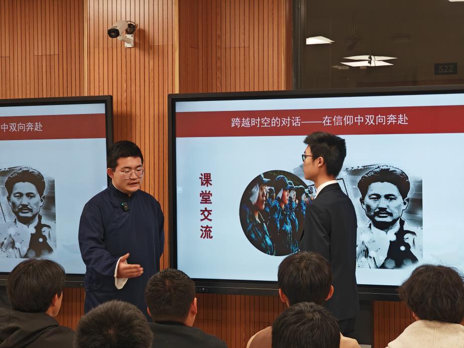 在师生同台环节,董品逸同学扮演的方志敏从历史中走来,与新时代的思政课教师、青年展开一场跨越时空的对话,在对话中引导大学生坚定对马克思主义信仰,坚定对中国共产党的信任。