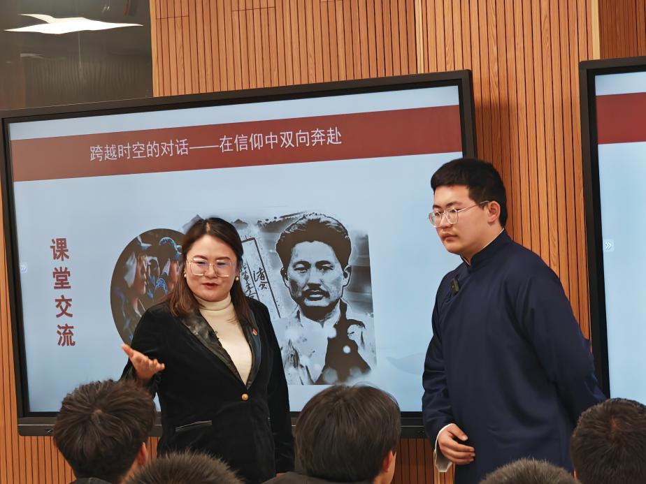 2023年11月30日,周春鹏老师在“思想道德与法治”课教学中开展“与信仰对话,为青春领航”的“师生同台”教学活动,引导同学们在与革命先辈的对话中,实现信仰的双向奔赴。
