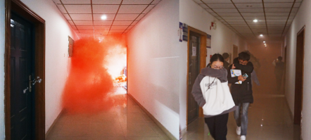 消防演练于下午4点准时开始。保卫处副处长周夏下达指令,模拟火宅险情开始,烟雾扩散,警报响起,实验员迅速引导学生按照消防逃生路线有序疏散,同时拨打火警电话,并触发火警警铃。消防人员进入大楼起火区域迅速扑灭大火。