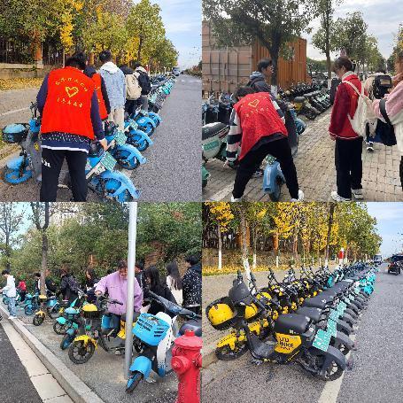 活动中,同学们以高涨的积极性和热情参加志愿活动。在校园大门外周边,他们分组前往各自负责的区域,将未停放在指定停车区域内的共享单车集中、有序摆放;在校园内,同学们将散落的零碎垃圾收检到垃圾袋中,学团活动需要使用的杂物、展板归类集中整齐摆放,对党团活动室进行了彻底的清理和打扫。