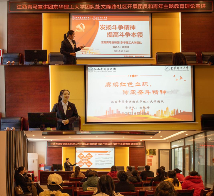为深入宣传习近平总书记考察江西重要讲话精神,2023年12月8日,江西青马宣讲团东华理工大学团队赴南昌市新建区文峰路社区开展团员和青年主题教育理论宣讲。