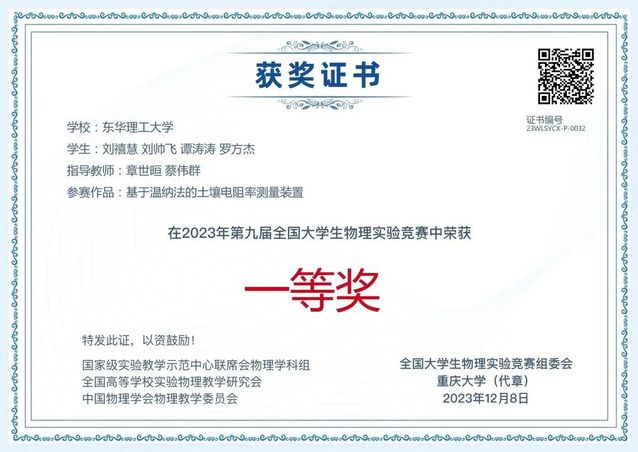 近日,2023年第九届全国大学生物理实验竞赛(创新)全国总决赛在重庆大学落下帷幕。东华理工大学选送的5支队伍斩获全国一等奖3项、二等奖2项。由地球物理与测控技术学院勘查技术与工程专业2021级本科生刘禧慧、刘帅飞、谭涛涛、罗方杰组建的团队作为学校5支代表队之一参赛,完成的作品《基于温纳法的土壤电阻率测量装置》成功晋级全国总决赛,并斩获一等奖,这充分展现了地控学子扎实的数理基础和较强的学科知识综合应用水平。