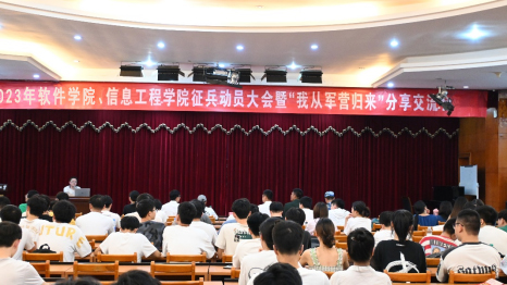 为响应国家征兵号召,2023年9月20日晚,信息工程学院、软件学院于软件楼四楼报告厅举办了征兵动员大会暨“我从军营归来”分享交流会。校保卫处征兵办负责人卢航老师、团委书记高彩凤、信工学院软件学院毕业班辅导员老师及三名退役军人代表武子栋、刘竟铠、陈文轩出席了本次大会。