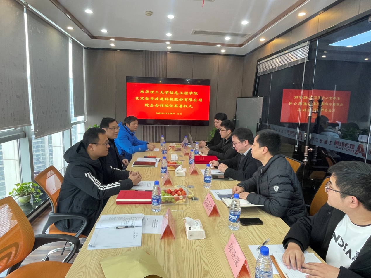 为进一步拓宽学生的实习和就业渠道,促进信息工程学院与企业“优势互补、资源共享、互利互惠、共同发展”的双赢局面,12月20日下午,信息工程学院副院长李祥一行赴北京数字政通(江西)科技股份有限公司签署院企合作协议。信息工程学院党委副书记郑纲、北京数字政通科技股份有限公司副总裁肖琦、工程技术中心东南大区总经理李逢华等人出席会议。