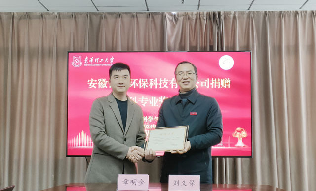 仪式上,周艺玮、章明金共同在捐赠协议上签字。刘义保为安徽钱洪环保科技有限公司颁发捐赠证书。