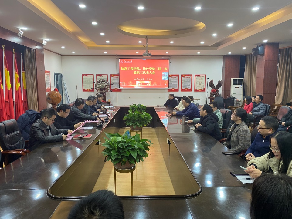 1月9日,信息工程学院、软件学院二届二次教职工代表大会在软件楼316会议室召开。会议由信息工程学院党委副书记郑纲主持,42名代表参加了会议。