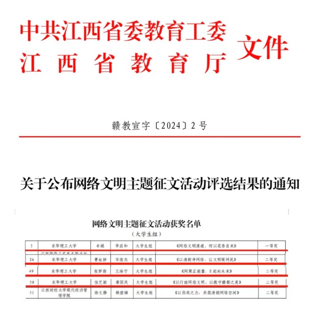 此次“网络文明 德润赣鄱”主题征文活动是2023年江西省“网络文明宣传周”的重要活动内容,旨在普及网络文明知识,加强网络文明宣传教育,引导广大师生树立依法上网、文明上网、理性上网的意识和正确的网络文明观。经单位推荐、专家组评审,共评选出网络文明主题征文作品一等奖42项、二等奖90项、三等奖132项,其中我院研究生牟娟的作品《网络文明漫道,何以花香自来》(指导老师:华启和)荣获大学生组一等奖,研究生张梦雨的作品《网聚正能量,E起向未来》(指导老师:王海宁)荣获大学生组二等奖。