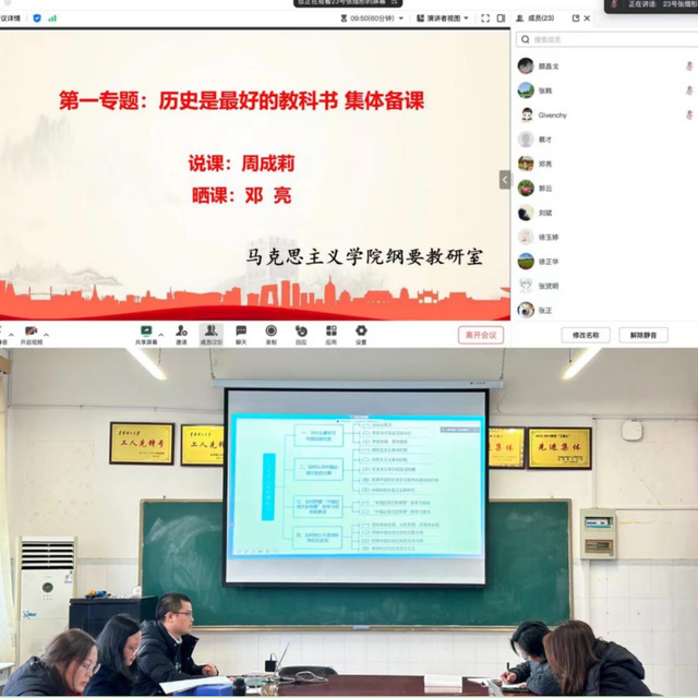 课程组聚焦“专题一 历史是最好的教科书”和“专题二 近代中国的磨难与抗争”,通过周成莉、危琦两位老教师说课,邓亮、郭云两位新老师晒课,全体教师评课的方式开展集体备课。