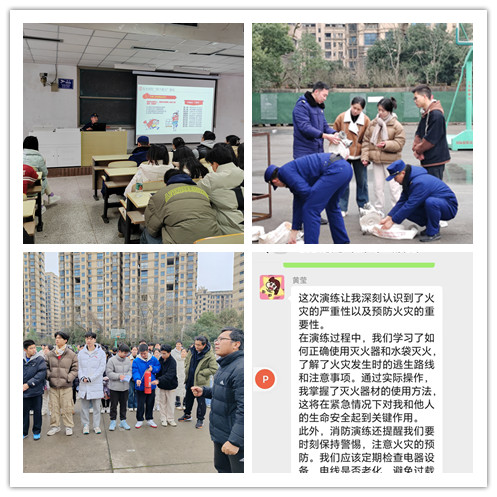 学生工作办公室组织学生通过江西智慧教育平台在线观看“开学第一课”(消防安全)等系列安全教育公开课,同时,结合学生实际情况,在宿舍中将同学们集中起来,通过线下+线上的方式,开展“安全教育”主题班会,围绕“消防安全”、“心理健康”、“不良校园贷和电信网络诈骗”等和同学密切相关的主题,运用案例、视频开展引导教育。学生工作办公室还组织同学们参加抚州校区开展的消防应急演练活动,并号召大家将演习心得体会发到班级群里进行讨论,引导全体同学提高消防安全意识。