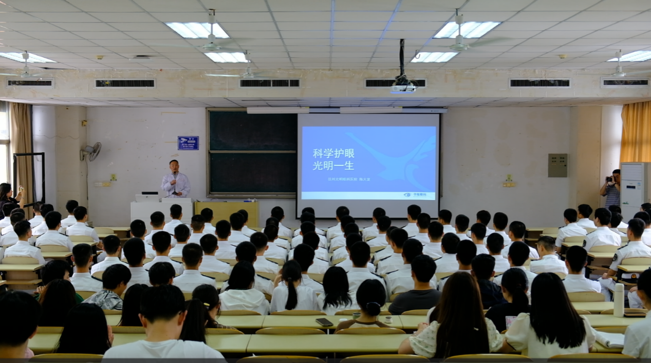 宣讲会中,陈大复教授以“科学护眼 光明一生”为主题详细介绍了眼球的构成、常见眼病及治疗、青少年近视防控和屈光近视矫正,同时向师生们普及造成近视的原因和生活中科学用眼的方法。