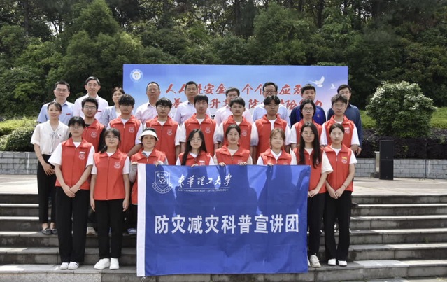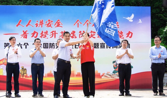 活动中,刘云海为东华理工大学“防灾减灾科普宣讲团”授旗,共同启动本次“全国防灾减灾日”主题宣传活动。