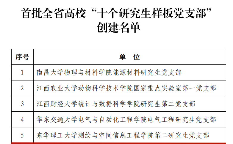 近日,中共江西省委教育工委公布了首批全省高校“十个研究生样板党支部”和“十名研究生党员标兵”创建名单,东华理工大学测绘与空间信息工程学院第二研究生党支部入选“十个研究生样板党支部”。