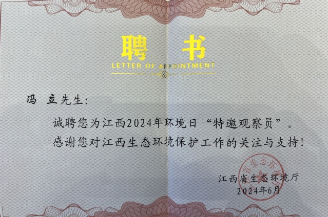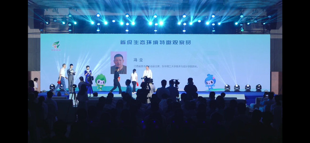 2024年 6 月 5 日是第 53 个世界环境日,宣传主题为“全面推 进美丽中国建设”。江西省生态环境厅联合赣州市人民政府于 6 月 4 日上午在赣州市共同举办江西省 2024 年六五环境日省级主场活动。主场活动采取“1”个主会场+“N”个配套活动模式。江西省人民政府副省长万广明、省生态环境厅党组书记余正琨、赣州市市长李克坚等领导出席大会,会场揭晓江西省级特邀环境观察员人选,美术与设计学院冯立教授受聘省级特邀环境观察员。