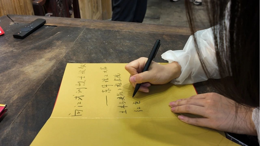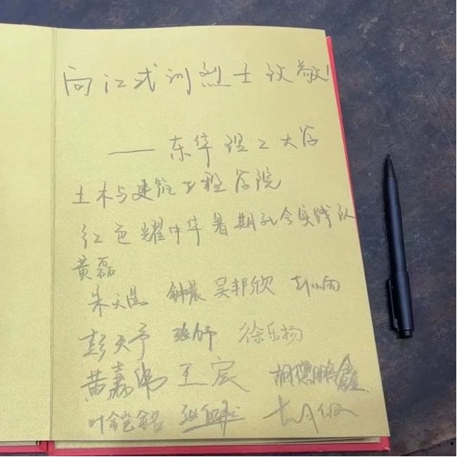 在江式训革命烈士纪念馆中,全体同学在娓娓道来的讲解中了解了江式训烈士的生平事迹与革命斗争经历,不禁肃然起敬。随后同学们在播放厅观看了《寻找江式训烈士》纪录片,江式训在隐蔽战线的英勇事迹,直到2008年,才被家乡人民知晓。同学们表示,要坚定革命理想,弘扬革命传统,永葆革命精神,以革命先烈为榜样。接着,全体同学怀着崇敬的心情在签名册上坚定地写下了“向江式训烈士致敬”,并纷纷签上自己的名字。