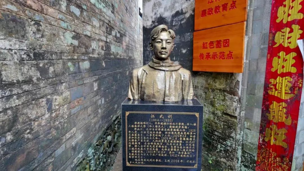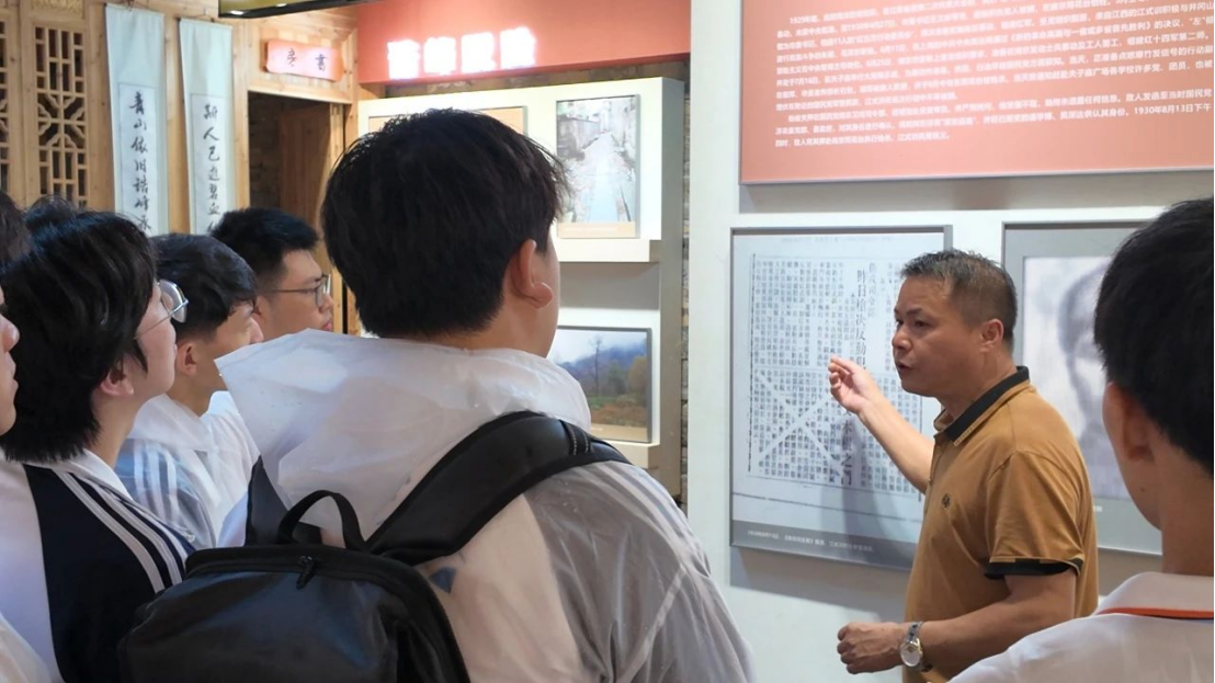 在这片瓷源茶乡之地,随处可寻初心的足迹,信仰的力量从古贯今。诰峰村紧邻安徽祁门,是第一批国家级绿色村庄、第四批国家传统村落、江西省“红色名村”,村落建筑风格独特,具有显著“徽派建筑”的特征。在诰峰村党支部书记朱根善的讲解引导下,暑期社会实践队成员们一路边走边记,参观了江式训革命烈士展陈馆。
