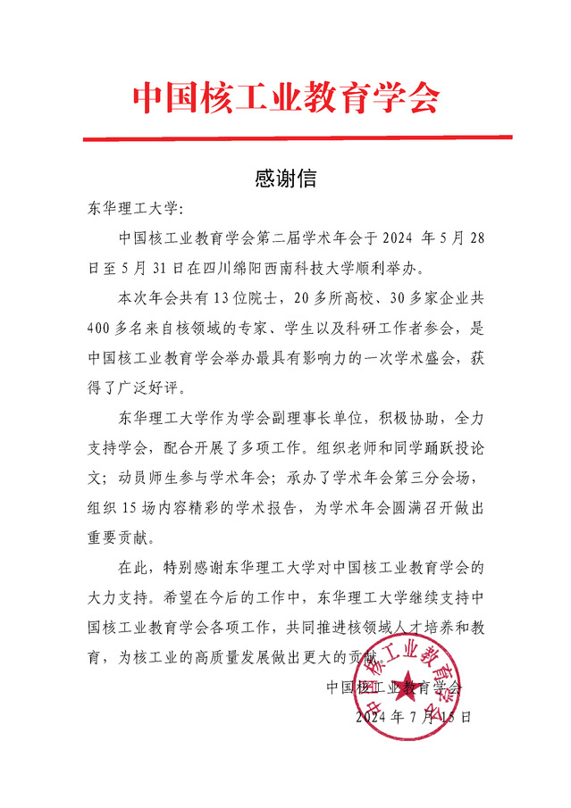 7月15日,中国核工业教育学会发来感谢信,对东华理工大学积极协助,全力支持学会,动员师生参与学术年会,组织老师和同学踊跃投论文并承办了学术年会第三分会场,组织15 场内容精彩的学术报告,为学术年会圆满召开做出重要贡献表示肯定和感谢。