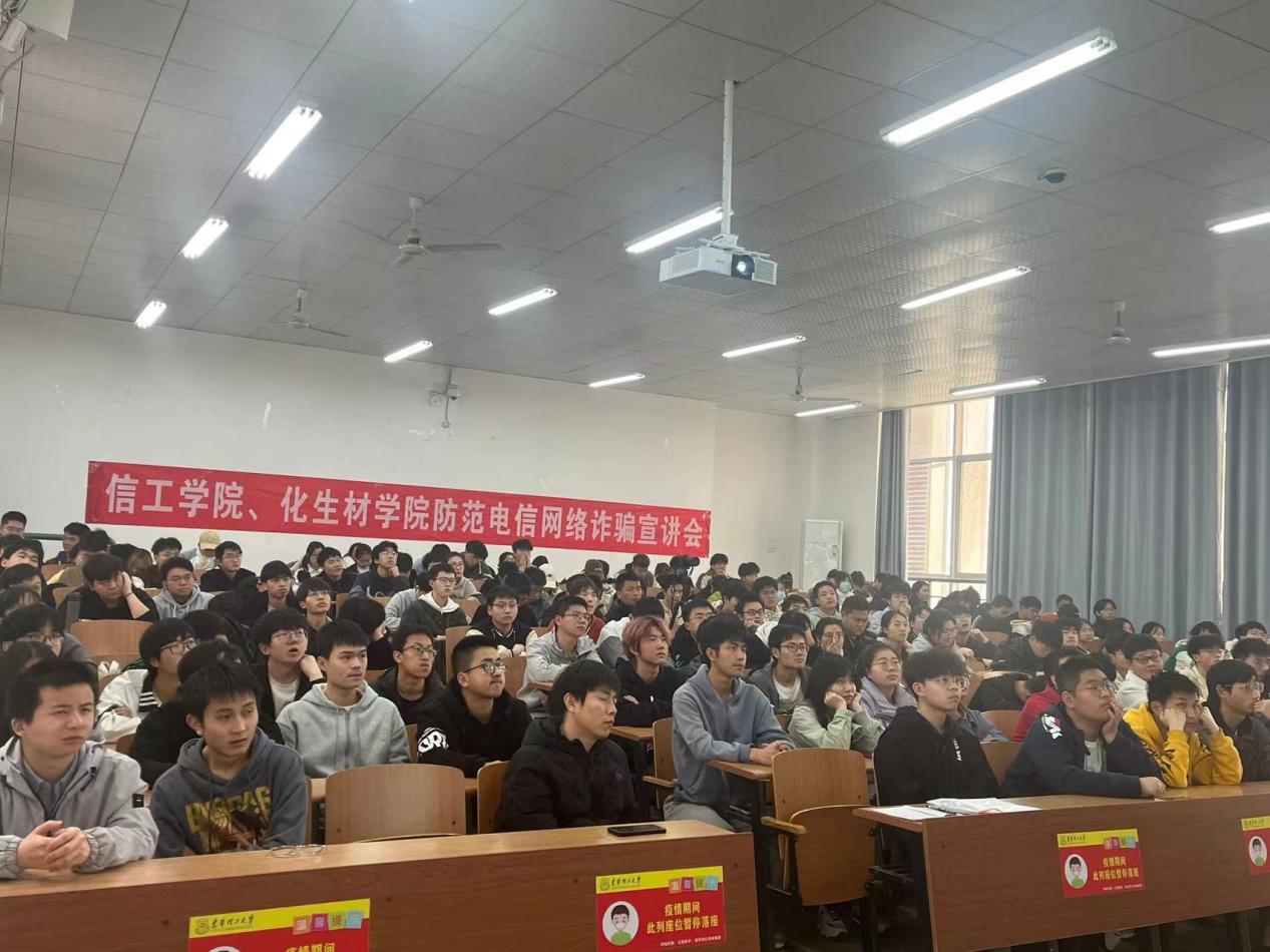 为落实校园防范电信网络诈骗工作,进一步增强大学生群体的安全防范意识,保障生命财产安全,促进平安和谐校园建设。3月28日,信息工程学院和化学与材料学院在三教阶13联合举办了防范电信网络诈骗宣讲会。本次宣讲会由南昌市经济技术开发区反诈中心杨心怡警官主讲,学院党委副书记郑纲、学院辅导员、学生代表共计200余人参加。