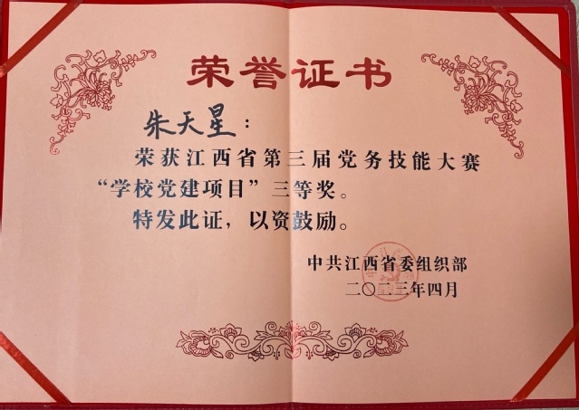4月7日,由江西省委组织部举办的江西省第三届党务技能大赛(学校党建项目)圆满落幕。大赛采取案例讲解和知识竞答相结合、线下切磋和线上交流相呼应的方式,来自全省教育系统51个单位的参赛选手同场竞技,充分展示本单位在落实全省基层党建工作重点任务,破解难题、推动工作中的实际举措、工作成效和经验启示。经过激烈角逐,我院教师朱天星斩获学校党建项目三等奖,这是学校在该赛事中连续三届获奖。