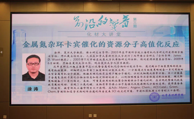 近日,化学与材料学院“化材大讲堂”之“前沿的声音”系列讲座第三期在南昌校区第四教学楼阶19成功举办。我校1998届优秀校友,来自复旦大学化学系的涂涛教授做了题为《金属氮杂环卡宾催化资源分子高值化反应》的学术报告,学院党委副书记马建国主持会议,学院各专业的近200名师生到场聆听。