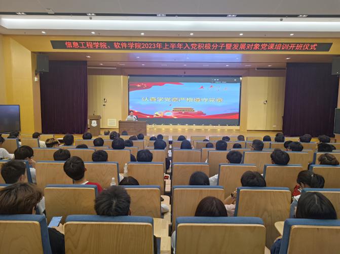 为深入学习贯彻习近平新时代中国特色社会主义思想主题教育(以下简称“主题教育”),更加自觉以这一思想武装头脑、凝心聚力,牢牢把握“学思想、强党性、重实践、建新功”的总要求,高质量做好党员发展工作,严把党员“入口关”,5月15日,信息工程学院、软件学院在新实验大楼一楼报告厅以线上线下相结合的形式,在南昌抚州两校区同步举办主题教育专题党课暨2023年上半年入党积极分子、发展对象培训班。学院党委书记许志文出席培训班开班仪式并作动员讲话、讲授主题教育专题党课,学院相关教师、入党积极分子和发展对象近300人现场聆听专题党课。活动由软件学院党委组织员周勇主持。